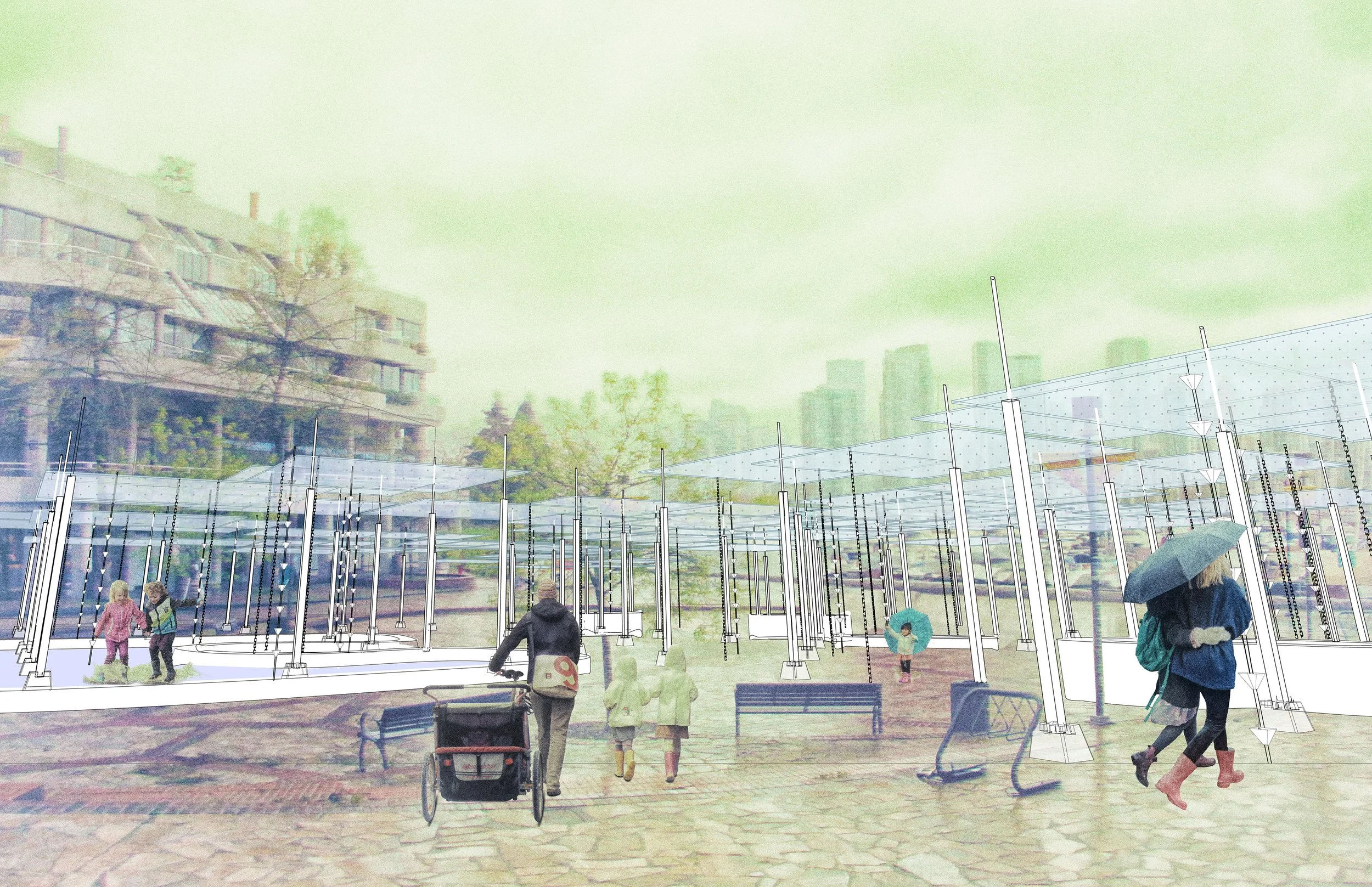 Rainy Vancouver. Many tolerate it; few embrace it. This intervention aims to capture the whimsical feeling of playing freely in the rain the way a child does, acting as both a destination for play and a moment of refuge. This functional sculpture encourages engagement and active participation through the celebration of rain; letting go under the leaky canopy.