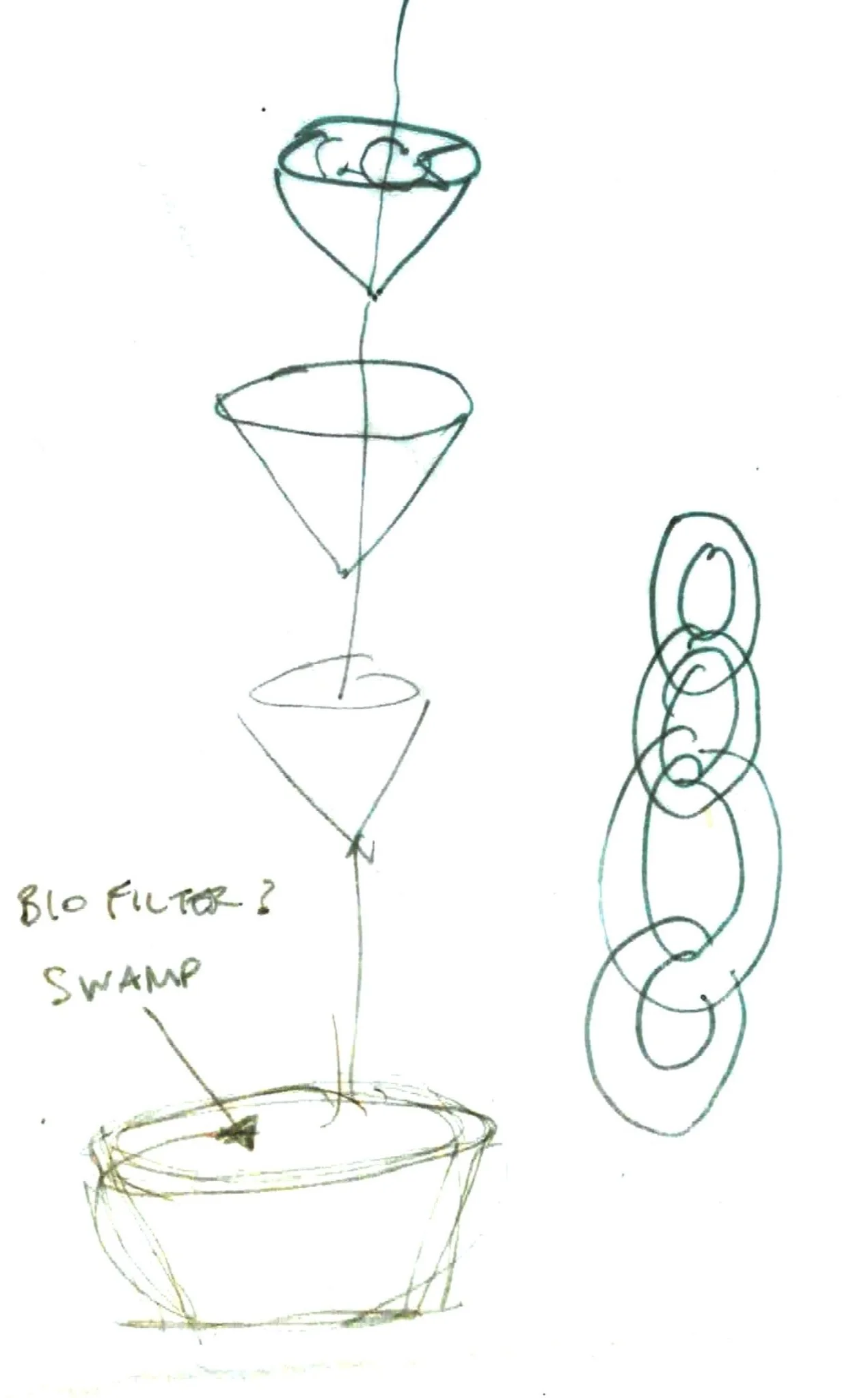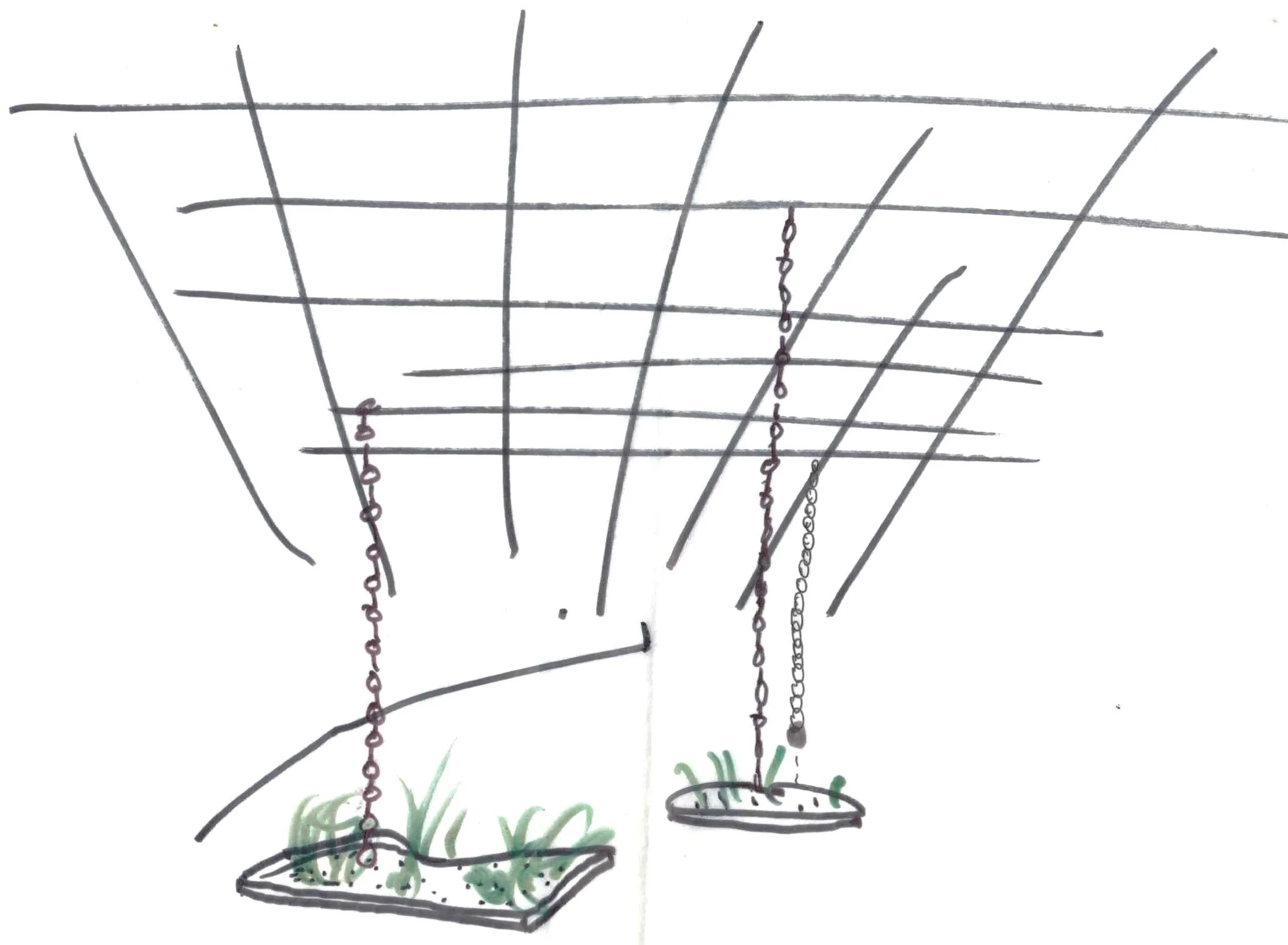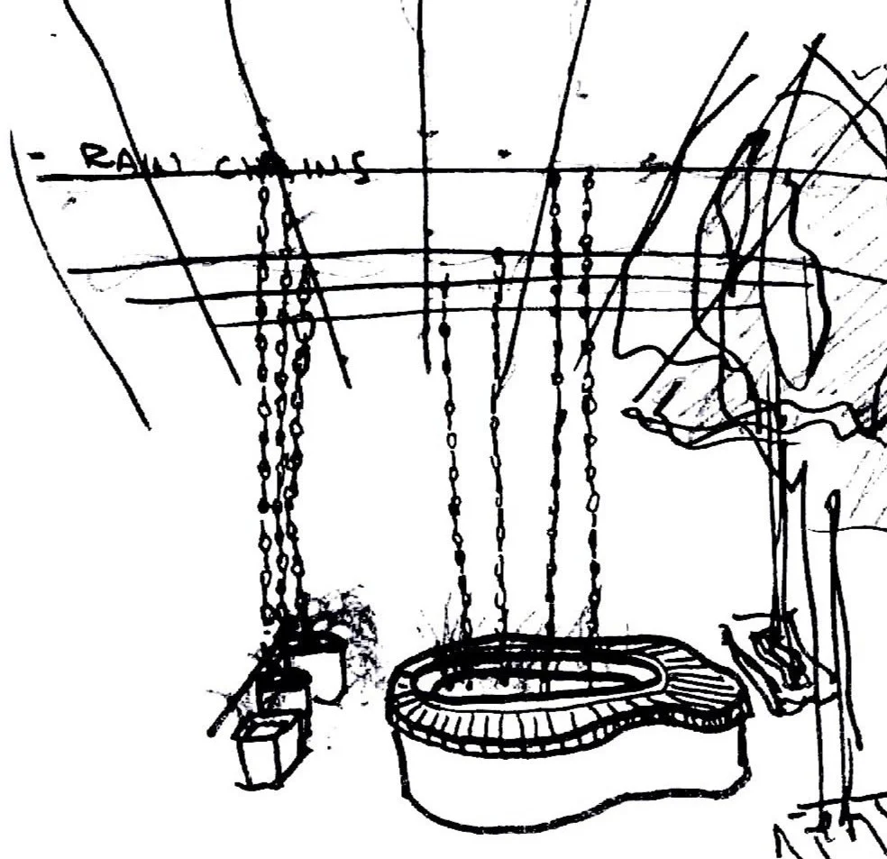 The rain chains carry the water from the top of the canopy to the ground plane with playful elements.