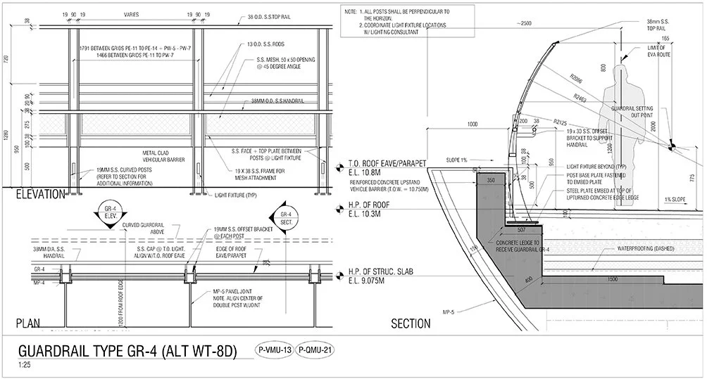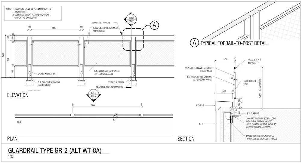The following are samples from a 1 year internship as part of a ‘Podium Facades’ team at Safdie Architects. I helped in developing a 3.3 billion dollar mixed-use project from its early Design Development phase thru 100% tender & contractor bidding. Responsibilities included development & maintenance of full drawing sets of podium elevations, 40+ building detail drawings (EPS sheets), design, development & maintenance of guardrail, stone cladding + precast concrete details a well as producing design sketches for coordination & development. Other responsibilities included maintaining and coordinating required changes to the design per inquiries from structural engineers, facade engineers, client queries and the on-site architect.