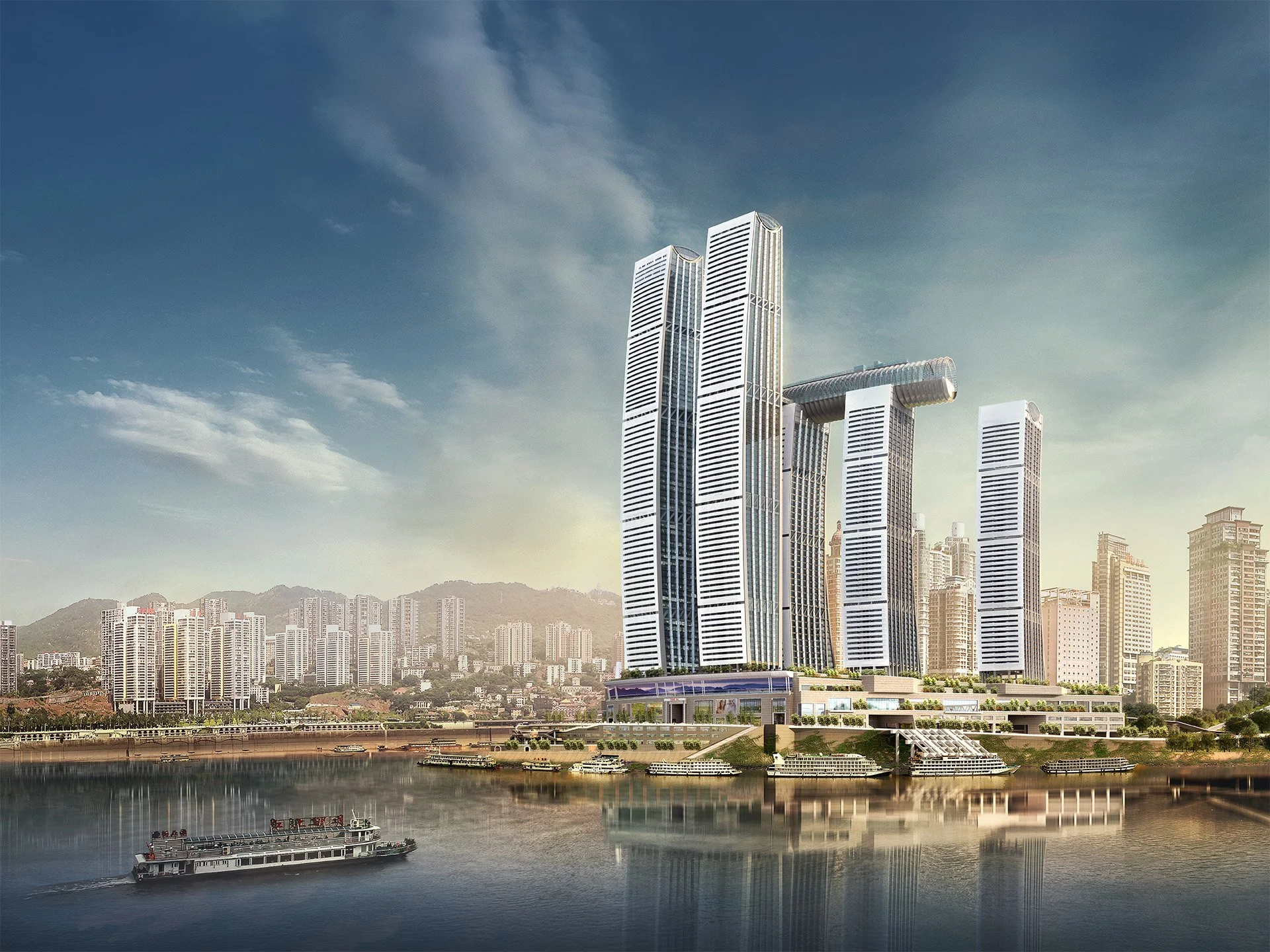 At the helm of the city, the project is sited at the very tip of the peninsula of the Yuzhong District where the Yangtze & Jialing Rivers meet; a major part of the city’s political, entertainment & economic activity. The sailing & shipping tradition for the city provided early inspriation for the parti - a ship setting sail. The podium design was full of many complexities; not only addressing massive programmatic requirements, the podium interweaves many existing streets in addition to providing additional connections & thruways across many levels that navigate around & within the site footprint. With regular flooding affecting Chongqing, the podium also accounts for receiving the high water levels the site is subject to. Providing natural light into the podium via the massive, irregularly-shaped skylights raised many design challenges & solutions as well.