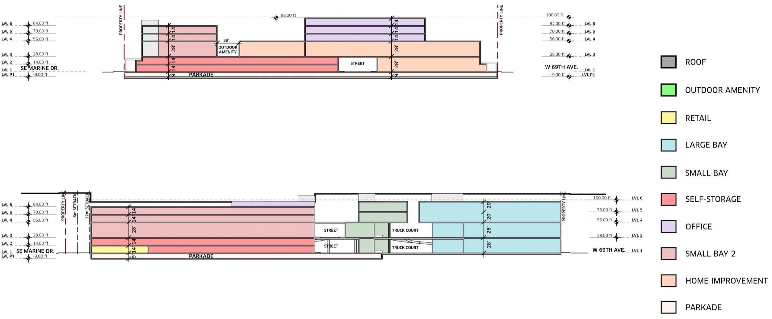 This early test-fitting & ideation sought to leverage the large footprint of the site to provide amenities useful to the neighbourhood within a modest building height whilst maximizing the large swathes of roof space for greenery, park spaces & walkability to connect a wide array of on and off-street rentable spaces on the non-industrial half of the site. This brought high potential for the building to respond to the changing needs of its neighbouring community over time.