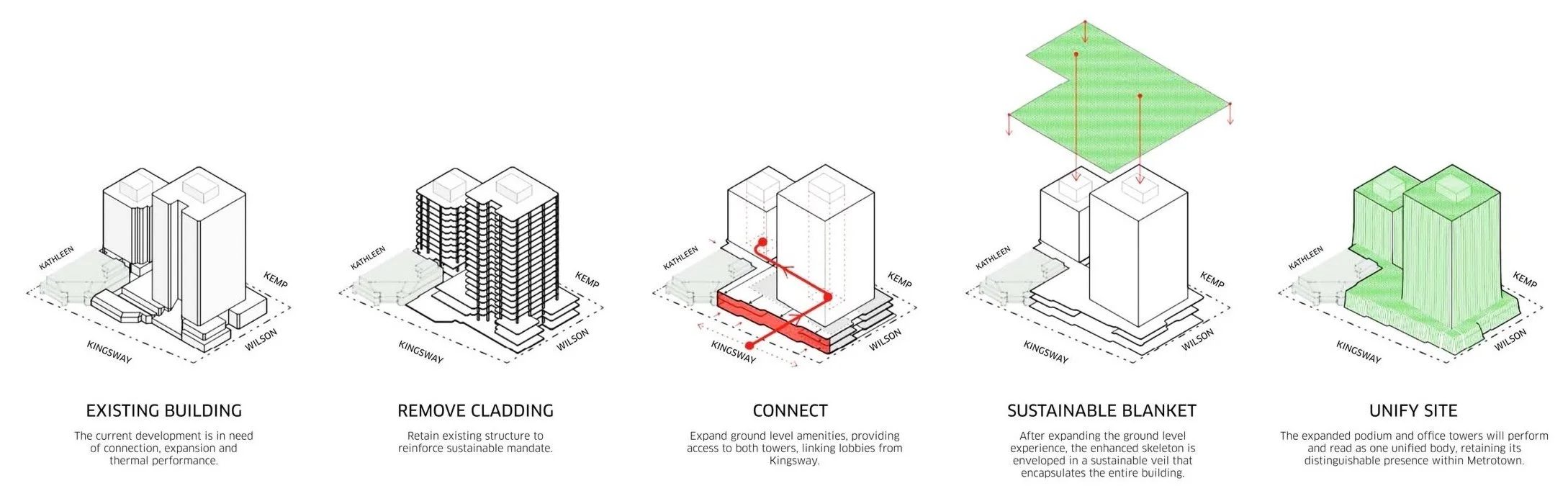 The office towers built in the early 80s are sited at the western gateway of the Metrotown Downtown neighbourhood on Kingsway. The development of the site and the buildings will include: improvements to the public realm; an expanded program to improve the office space; increased retail and amenity spaces; and upgrades to the building envelope to improve energy performance and meet Step 3 of the BC Building Code.