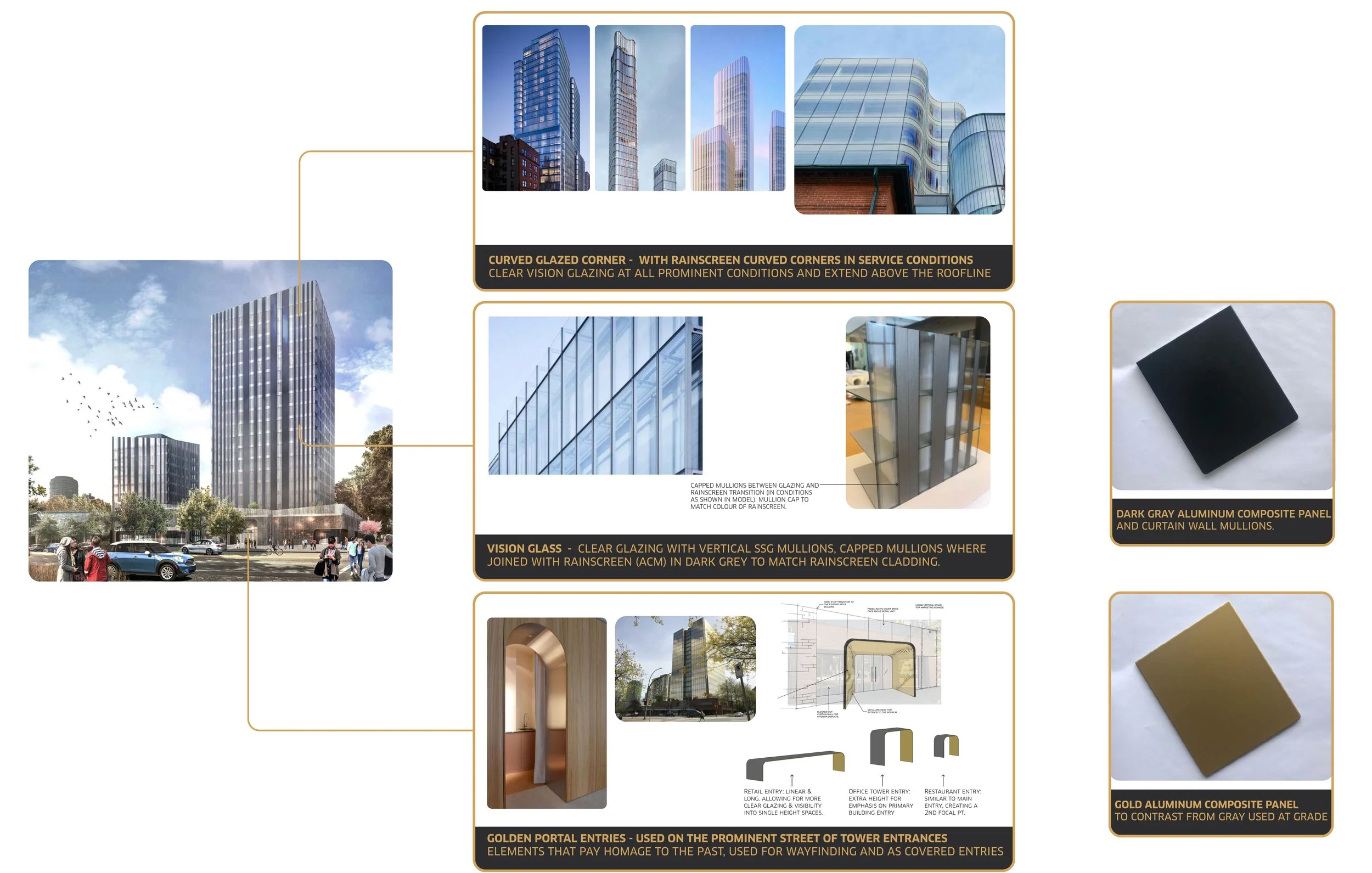The parti consisted of three main moves: maintaining the existing concrete skeleton, providing access to both buildings with a wide entryway frontage, and unifying the entire site with a high performance facade.
