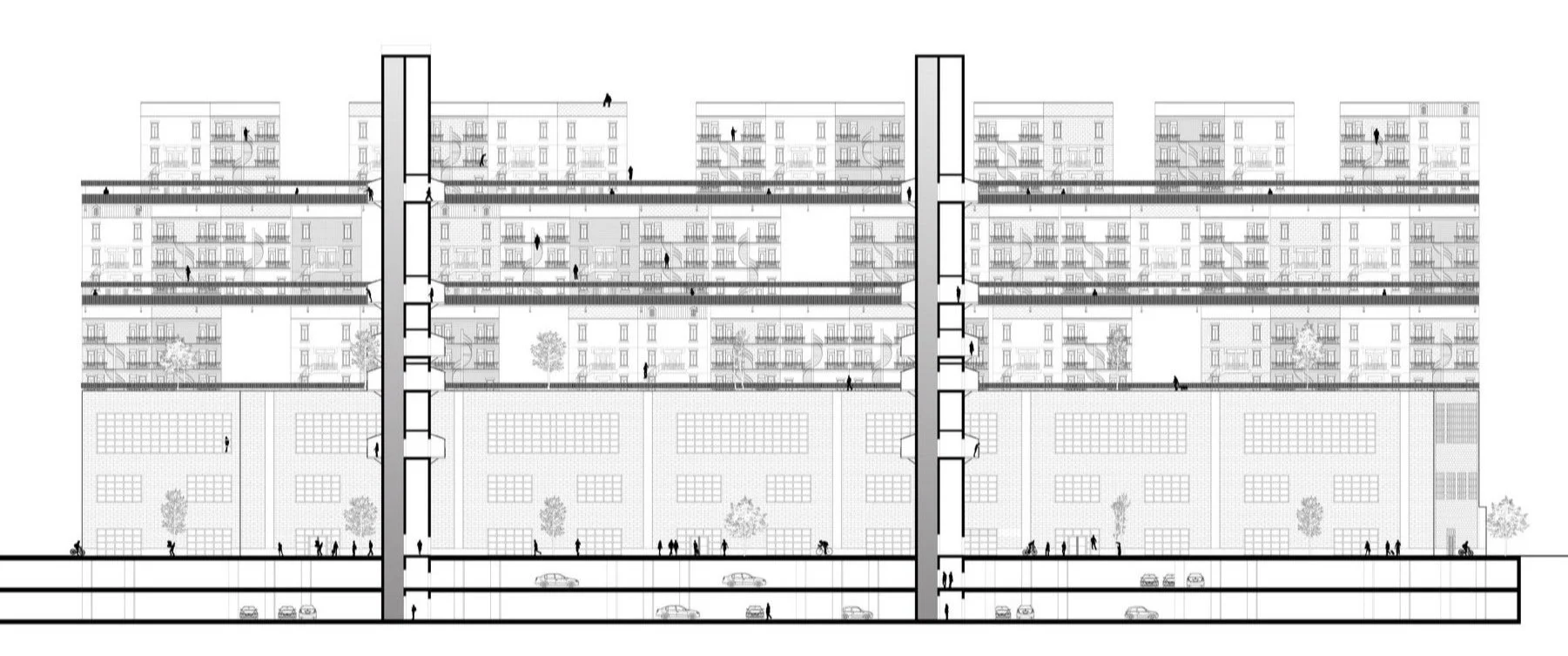 The project creates a dichotomy between residential and commercial dynamics to rectify the programmatic chaos of mixed-use projects. Small shops and retail are continuous along the outer edges of the site, while larger programs are accessed via a continuous central plaza which runs the length of the site. Agglomerations of Montreal’s classic rowhouse are allocated on the upper levels with their own dedicated circulation system. Independent elevator towers branch out of the center of the site through sheltered catwalks, with fire escapes providing secondary access. Vertical stacking, or elevated car-free street blocks maintain access to views, light and cross-ventilation for each townhouse unit.