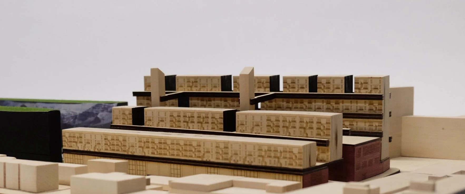 A rough sketch model was implemented as the primary testing strategy for organization & relationships between the Commercial programs at the ground level, Residential Massing via stacked rowhouse modules, and low-impact, external circulation pathways. The goal was for each of the 3 elements to have distinct aesthetics so that users could make clear visual distinctions between what programs they could, and could not access.